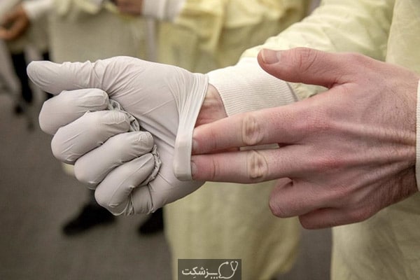 - هنگام دست زدن و یا تماس با خون، مدفوع یا مایعات بدن مانند بزاق، مخاط، استفراغ و ادرار بیمار حتما از دستکش یکبار مصرف استفاده کنید.